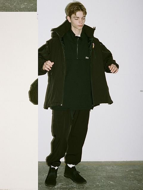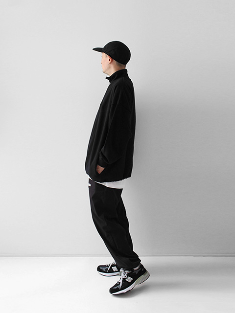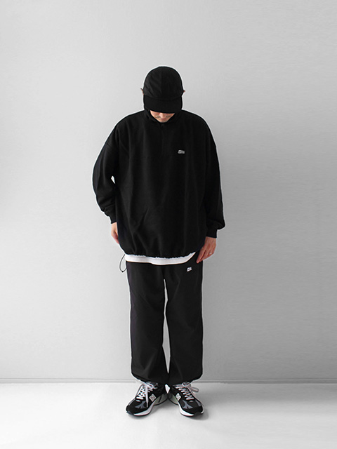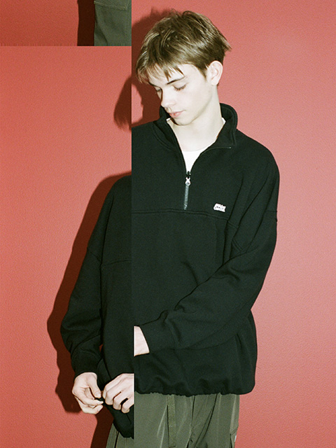 タオルの様にパイル状に編むことで空気を含み、快適な着心地を実現した裏起毛素材のスウェット。トレンド感のあるスタンドカラーのハーフZIP使用。裾を絞ってシルエット変化も可能。オーバーサイズのビッグシルエットで胸にワンポイントの刺繍を施したシンプルで使い勝手の良い1着。