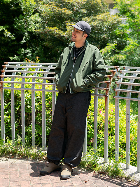 フロントジップあり、フロントポケット2つ、バックにオリジナルドットスナップボタン2つ。 袖口は紐テープにより調整可能。