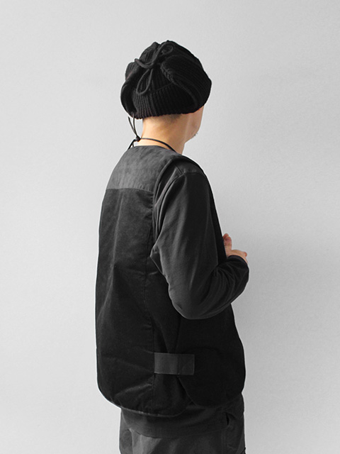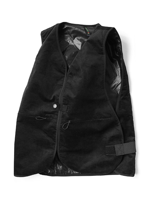 中綿入りのコーデュロイベスト。スポーティーな脇の切替により若干のサイズ調整や取り外しも可能。