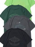 背面に凧ロゴ(一部刺繍)、フロントにラジャブルック蝶モチーフロゴ(刺繍)、袖に同色プリントを施した伸縮性のあるドライ生地のTシャツ。