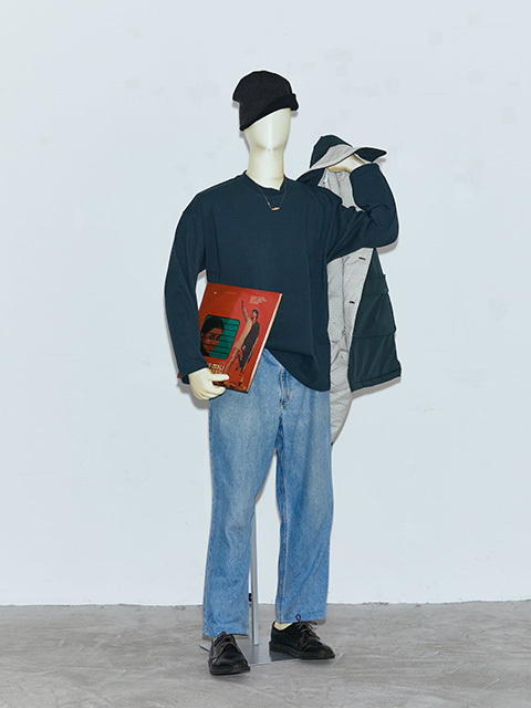 袖裏の切替と首元のリブにデザインを入れたシンプルなロングスリーブTです。一見シンプルですが、人と違う少しの違和感を与えてくれます。