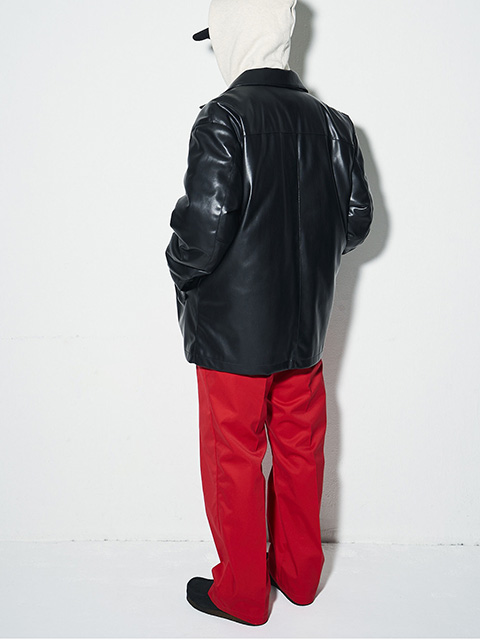 「ここ数年レザーの古着を買いまくっている。シボ革のハーフコートからゴムが入ったおじさんっぽいブルゾンまで様々だ。レザー熱が上昇している中、もちろん本革でサンプルを作ってみたものの、納得いくクオリティと価格にならない。そこで昔は絶対に使うまいと思っていた合成皮革を使ってみたところ、思いの外いい感じに仕上がった。しかも軽くて安い。今着るならこっちのほうがいいんじゃないかと今は思っている。そんなフェイクレザーのハーフコートができた。アームも太いのでレザーでありがちなうっ血の心配もなく、手入れも楽。うん。今は間違いなくこっちだな。」
