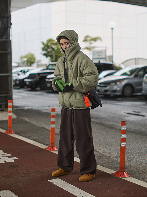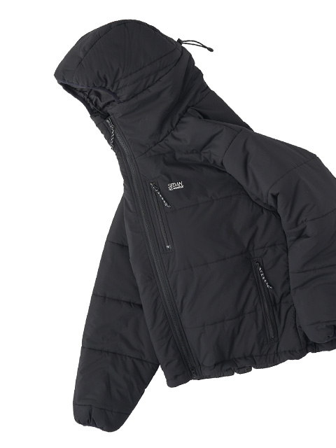 「ダウンも好きだがそれ以上によく着ているのが中綿入りのジャケット。軽い、洗える、あんまりスタイル選ばない(ような気がする)とサクッと着るのにちょうどいいのだ。さらにフードが付いていたら最高ということで、大好きなあのモデルをベースに一番欲しい中綿のアウターを作った。シェルにはコーデュラ®ナイロンストレッチの極薄生地を使用。薄くて軽いが強度もあるという優れ者。生地感もほどよくマットでアウドドア臭が出すぎない、街で着るのに最高のアウターになったと思う。フードもボリュームがあり、被ったスタイルもよきな、セダン的推しの一着。胸にセダンのロゴ刺繍。フードの後ろ、身頃裾にアジャスター。ビッグサイズの内ポケット2つ。」