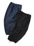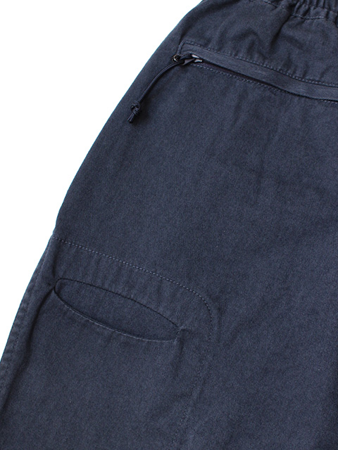 「最近は定番で作っているオーバーパンツ。通年履けるコットンツイルに洗い加工を施してビンテージっぽい雰囲気に仕上げました。定番とはいいつつもシルエットも定期的にアップデートしているので大変履きやすく、良いシルエットが出ていると自賛しております。ウエストはゴムと紐で調節可能。裾もドローコードで絞れます。ヒップポケットはファスナーポケット。ヒップポケット口にロゴ刺繍入り。左太腿部分にちょっと変わった形のスマホポケット付き。」