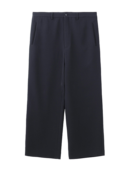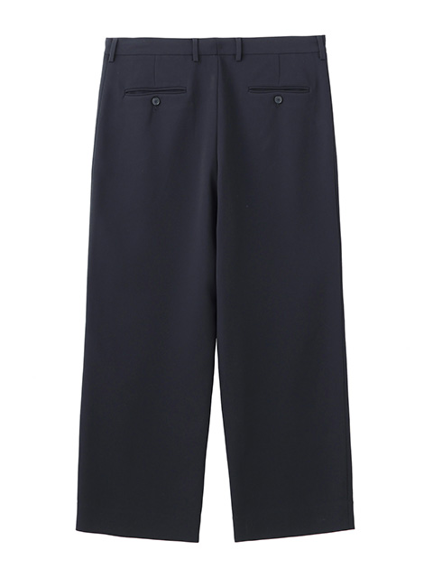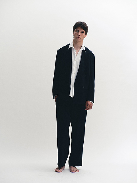 「SEDANには各国にお手本というか憧れのデザイナーがいるのですが、スーツを作るならイタリアの巨匠や日本の暴力系映画監督の世界観をイメージした物をと考えていたのですが、ついに作ってしまいました。押さえるべきはなんといってもゆったりとしたスーツのパンツとしてのドレープ感。毛芯を入れたり、手作業でいせ込んだり…といった精密機械のようなスーツではなく、歩いた時の生地の揺れやちょっとしたセクシー感を出すべく、これまたレディースのスーツでよく使われていた憧れの素材、トリアセテートを使って作りました。シワになりにくく手洗いも可能なので、単品のパンツとしても活躍間違いなしです。同素材のジャケットもあるのでスーツとしても着ることができます。」
