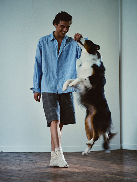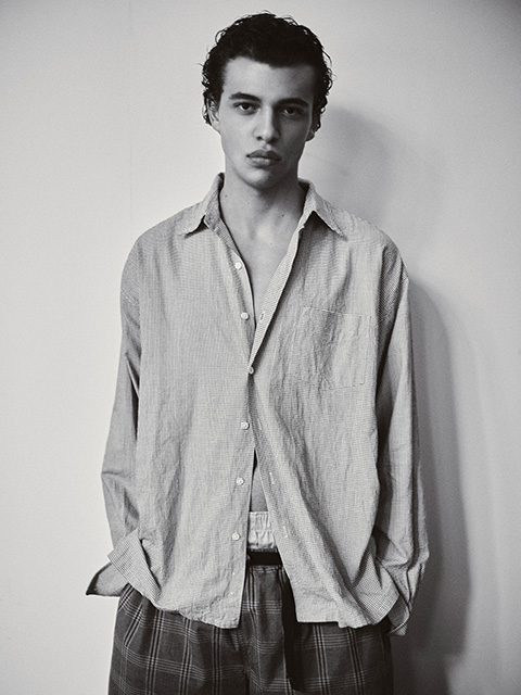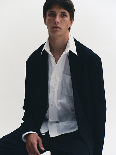 「ずっと定番で作っているボタンダウンのシャツ。今シーズンはちょっと気分を変えて、裾をフラットな仕様に変更しました。ボタンダウンといえば通常はラウンドした裾が当たり前というかある意味ルール化しているような気もしますが、裾がフラットになるだけでちょっとした違和感が出て、いい意味で特徴的なシャツになりました。素材はこれまた定番のオックスフォードながら、軽く、肌離れが良い特殊な織り方なので、春夏時期にはぴったりです。」